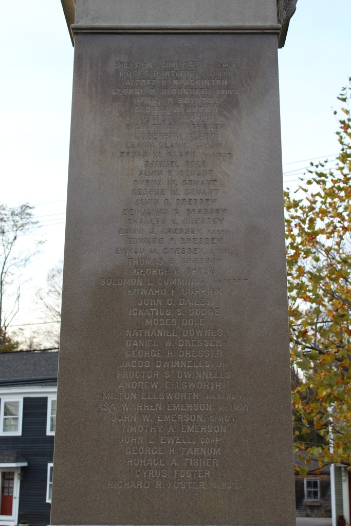 On the pedestal are the names of the 128 men from the town who served. Of these, approximately 16 did not survive…exact figures are not readily available from local sources. A quarter of these casualties died during the Port Hudson campaign in Louisiana while serving with the 48th Massachusetts Infantry—three of them from disease and one killed during the assault on Port Hudson. Nearly all of Rowley’s war dead were shoemakers, four of them farmers, and one listed as a “gentleman.”[2]