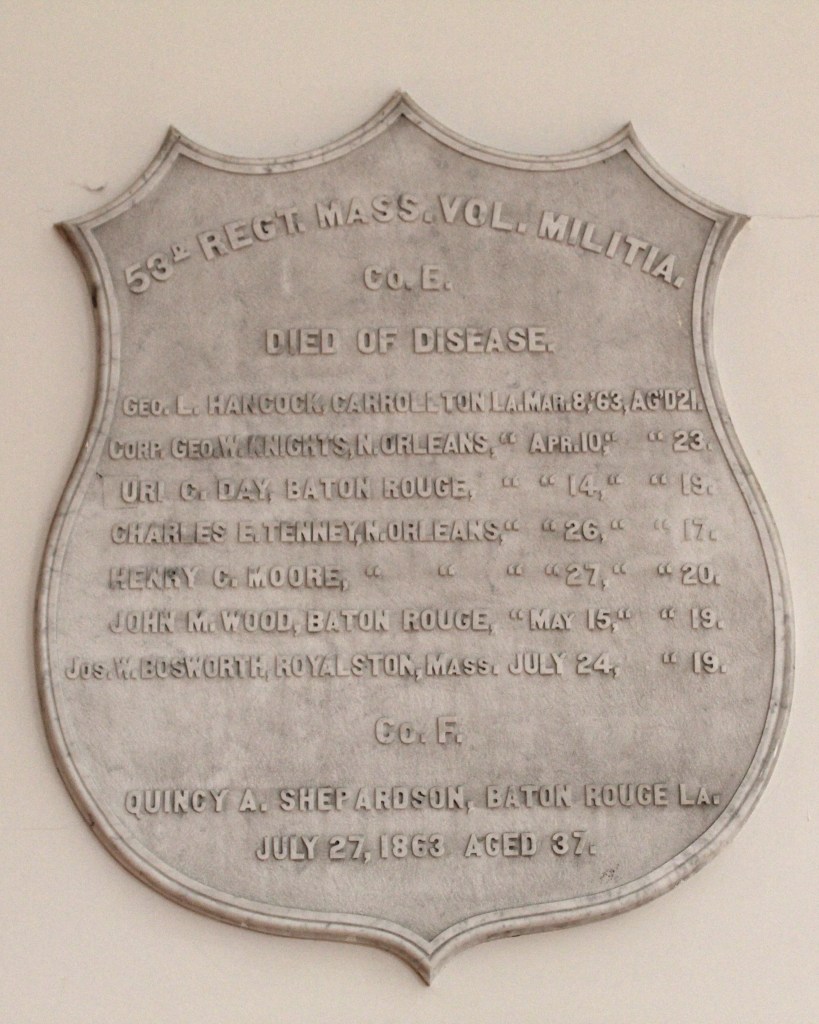The town’s first casualty was Chauncy Norcross, a 21-year-old private in the 21st Massachusetts Infantry, who died from wounds received during the Battle of Roanoke Island. Later in the war, 25 more men from Royalston joined the 53rd Massachusetts Infantry, which participated in the Port Hudson Campaign. This regiment suffered a high death rate from disease, largely due to poor camp conditions in the Louisiana bayous.