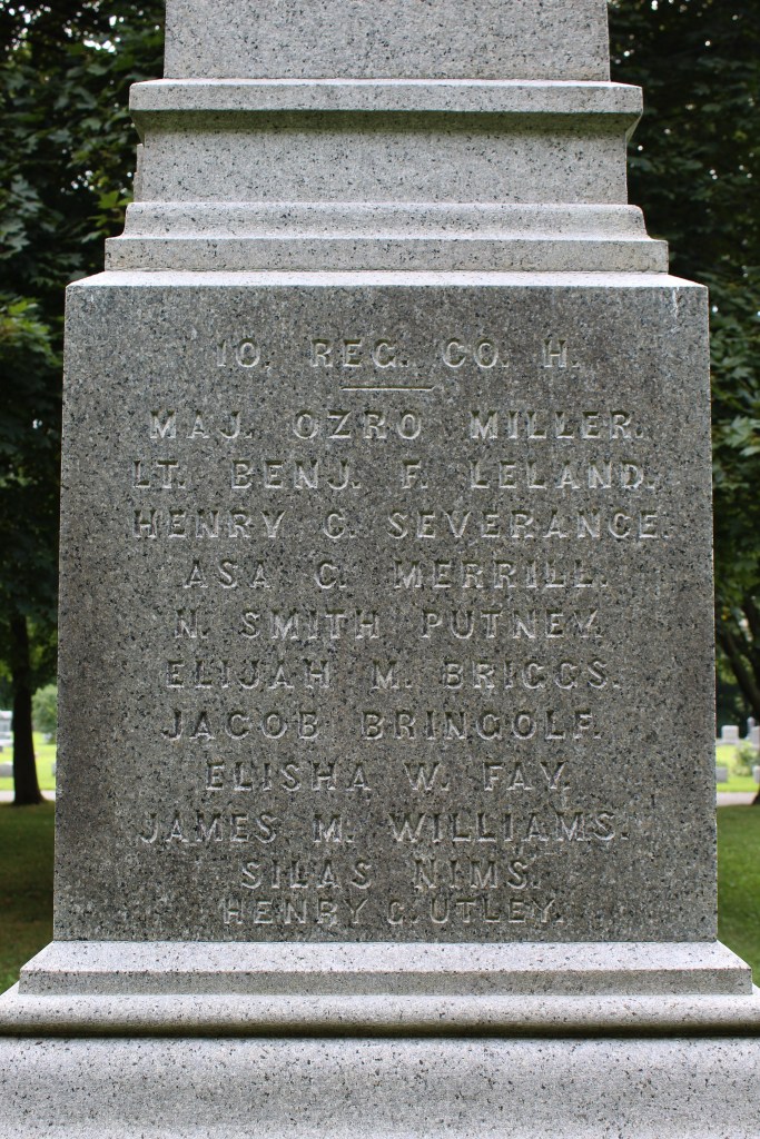 Initially, Shelburne chose a central location on the town green next to the Baptist Church (no longer standing). Arrangements moved forward and the monument was hauled to that location. However, those favoring a more sacrosanct location eventually won out and the monument was erected in Arms Cemetery, a quiet spot well north of town.[1] Installation began in October 1868. The date of completion and dedication are presently unclear. The primary inscription reads, “In honor of the fallen soldiers of Shelburne.” The front of the monument also lists the numbers lost, “Killed or died of wounds 14/Died in Rebel prisons 5/Total 26 from all causes”